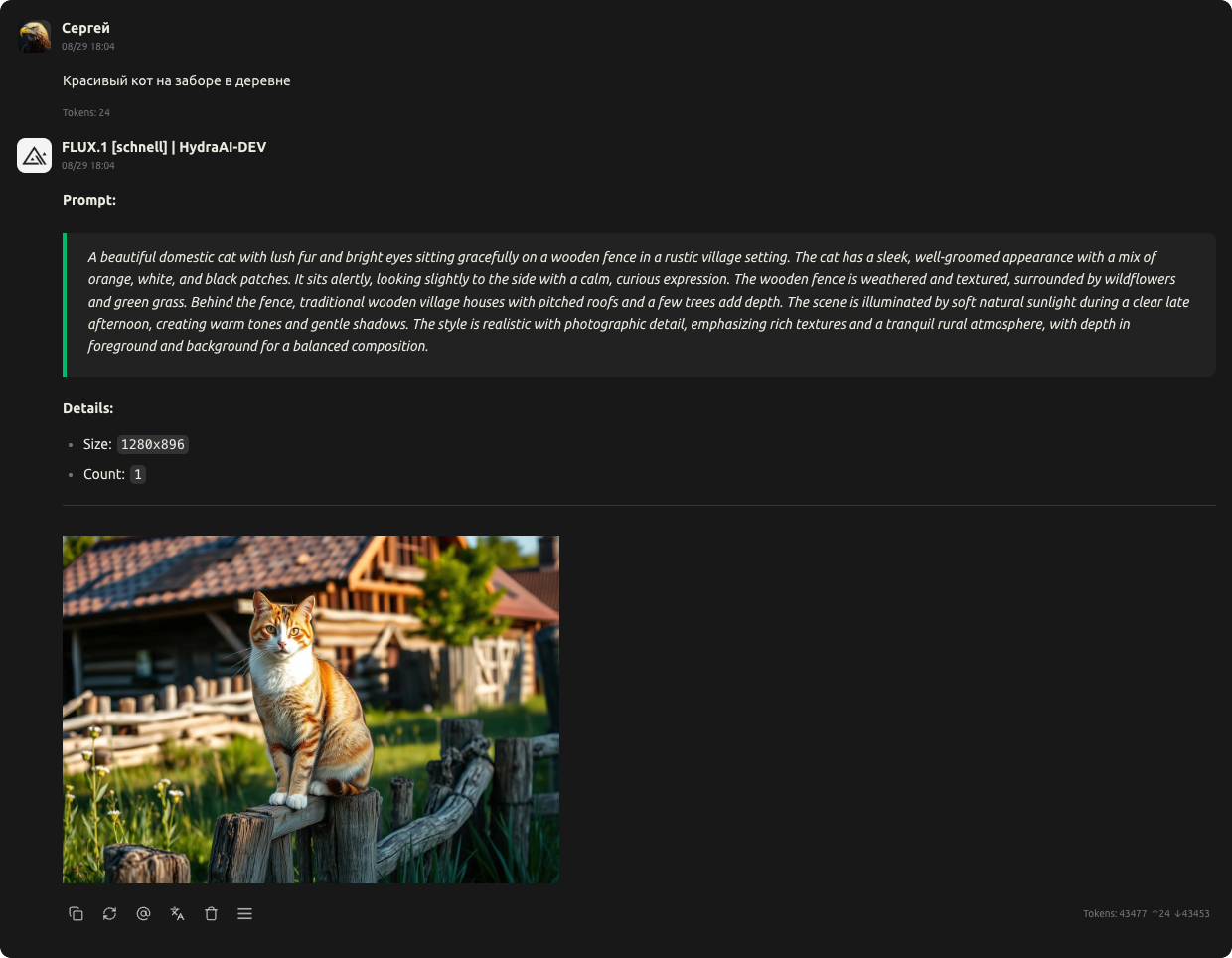 Данная функция позволяет вам создавать уникальные изображения, просто описывая их в текстовом сообщении. Ваш запрос отправляется через API-эндпоинт /chat/completions, но с выбором специальной модели, предназначенной для генерации изображений. Вся техническая работа по преобразованию вашего запроса в детализированный промт для нейросети и автоматическому подбору необходимых параметров генерации осуществляется нашей системой.