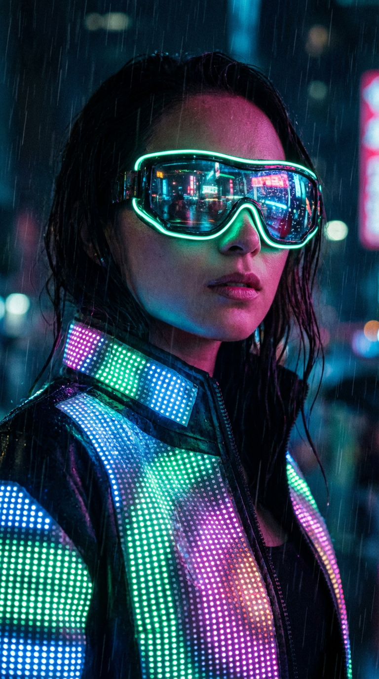 Портрет девушки в стиле киберпанк, неоновые очки, светящаяся куртка, темный фон, кинематографичное освещение. 9:16