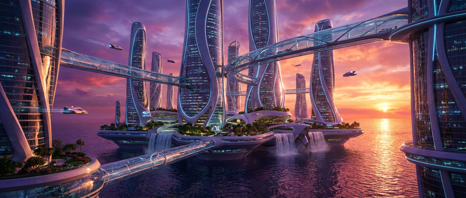 Футуристический город на воде, закат, фиолетовые и оранжевые тона, высокая детализация. Соотношение сторон: 21:9